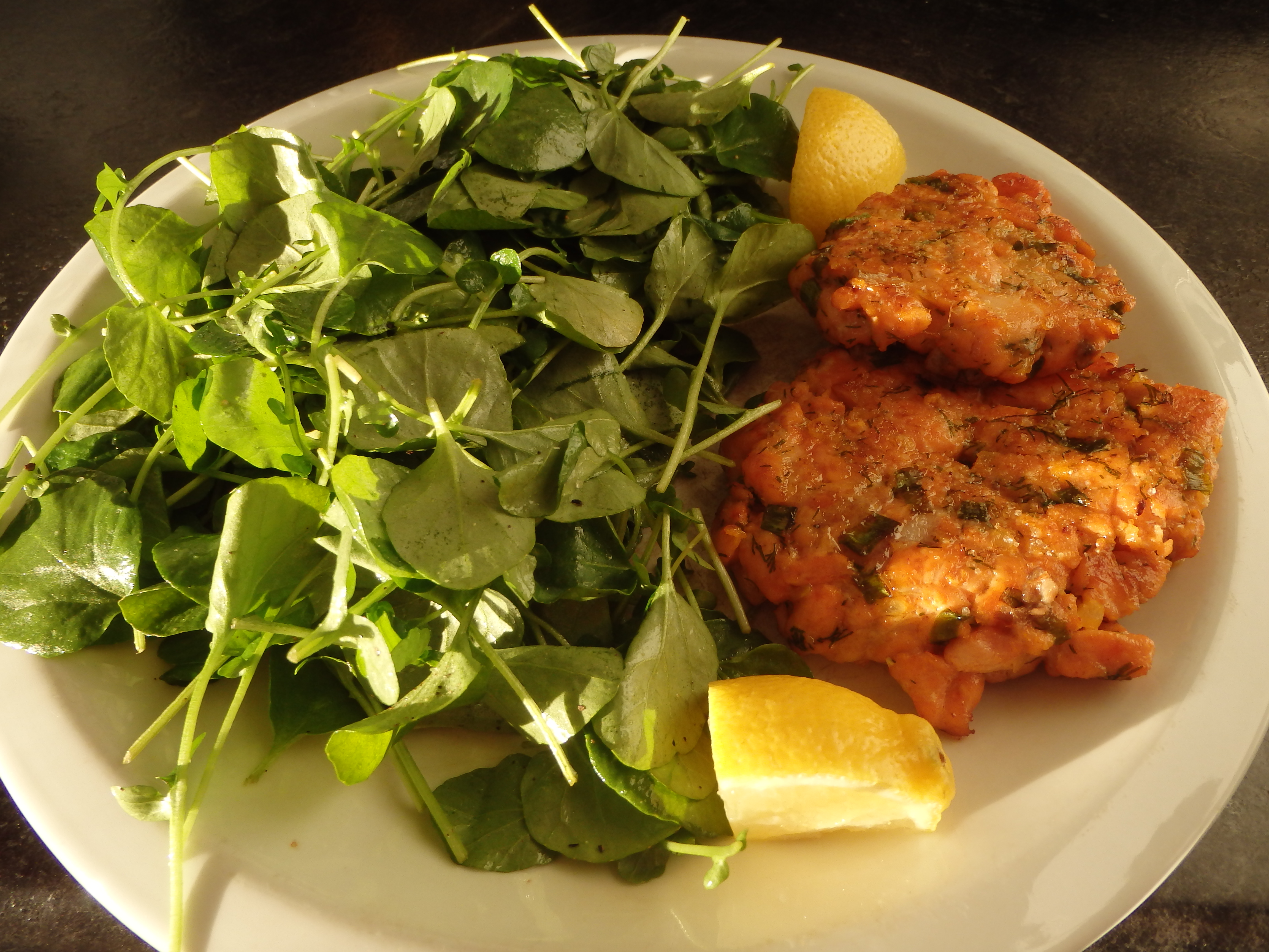Ingredients: Wild Caught Salmon, shallots, dill, smoked paprika, salt, green onion, a little red pepper flakes, watercress, lemon, salt, pepper, extra virgin olive oil. Sear burgers in olive oil on medium heat until browned on each side.