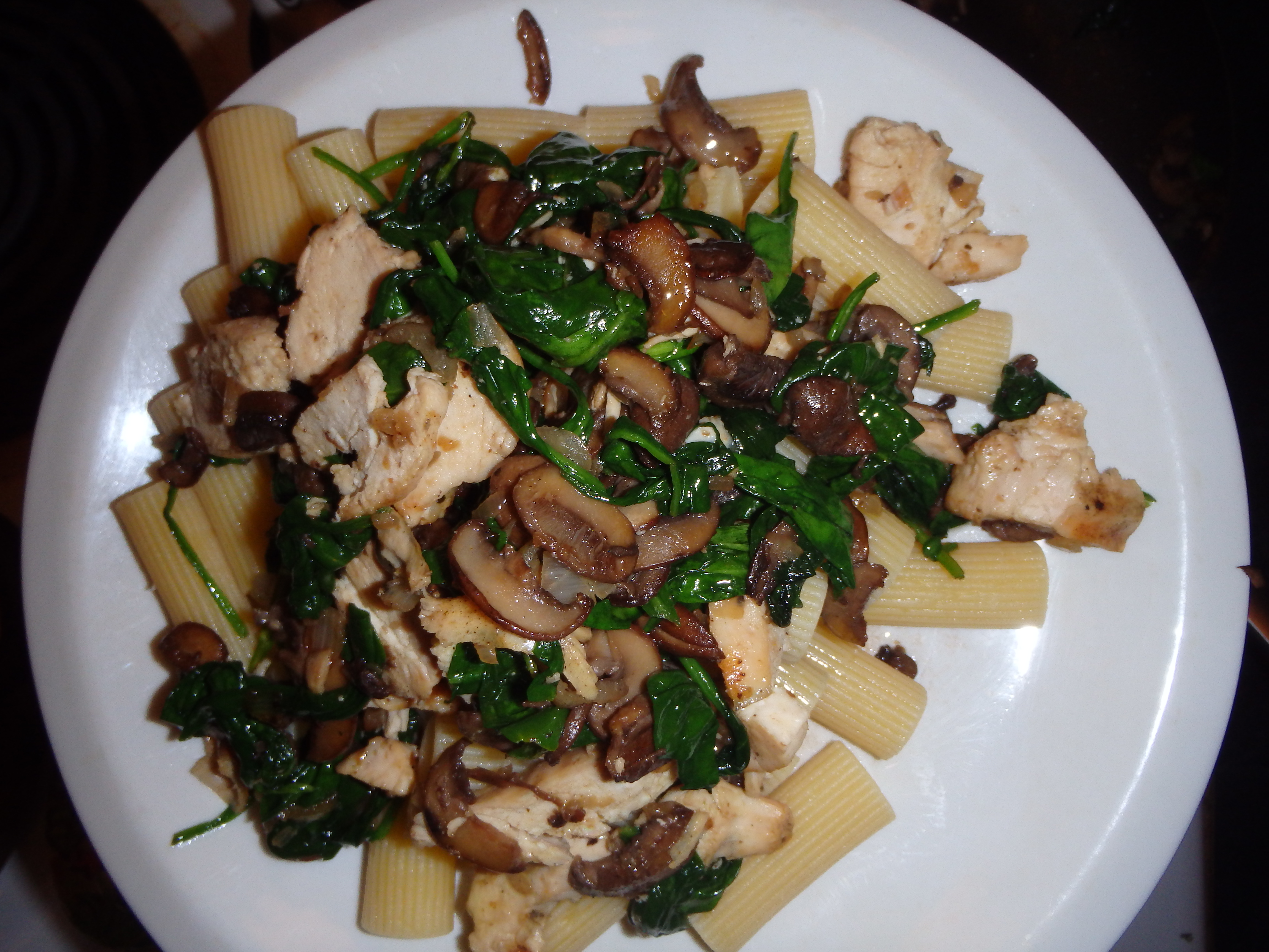 Ingredients: Al dente rigatoni, extra virgin olive oil, saute baby bella mushrooms in olive oil and butter until liquid evaporates, then add shallots, then add grilled chicken breast (grilled taste adds nice flavor!), add organic spinach, sprinkle in sea salt. Take off heat and mix all together with white truffle oil. Mix in rigatoni.