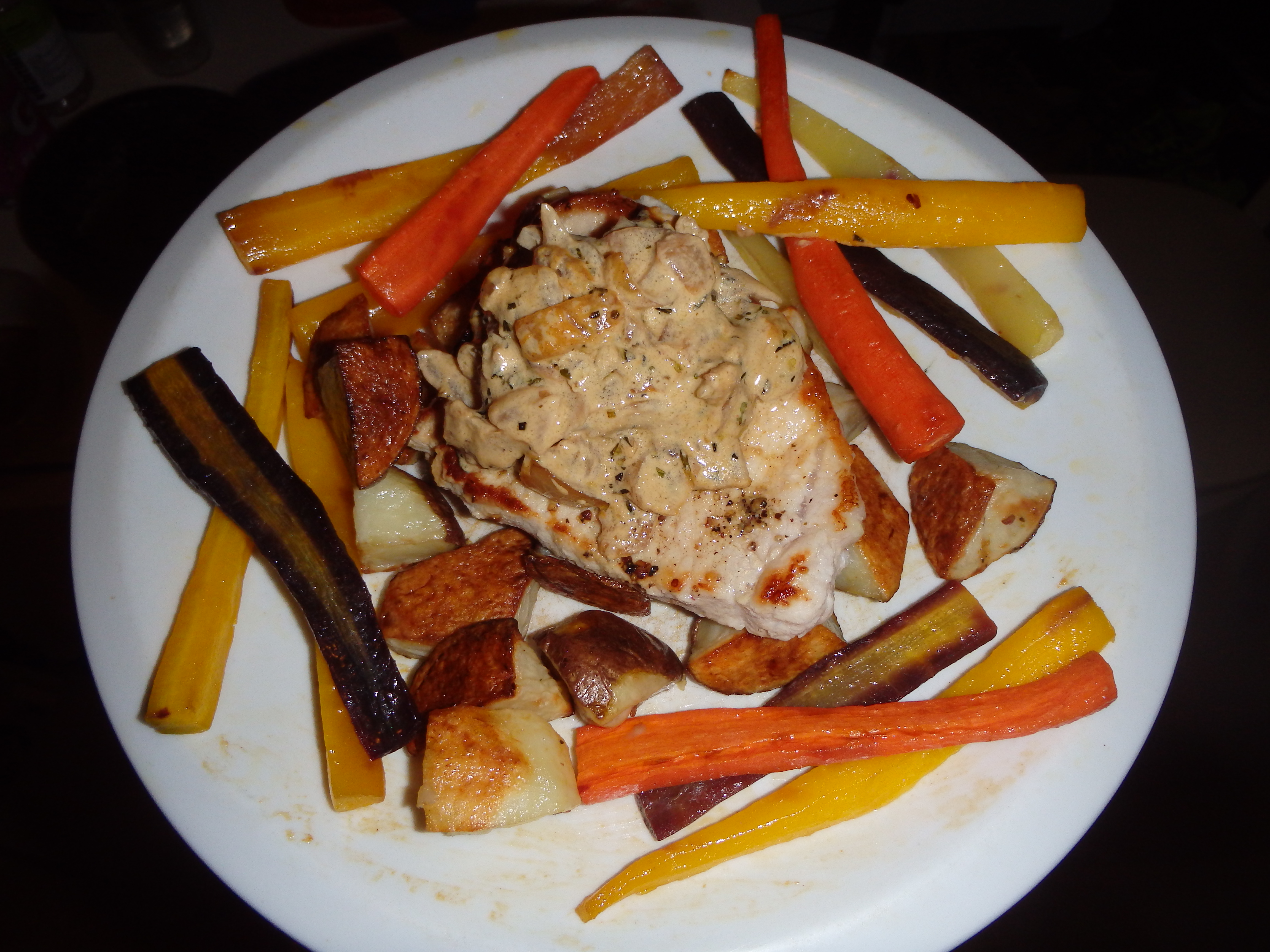 Ingredients: Seared pork chops covered in olive oil, salt, and fresh ground peppercorns using a mortar, after pork chops are seared, in same pan add in the vidalia onions with extra virgin olive oil. Midway through onion browning process, add in butter and diced up rosemary. Add more salt and fresh ground peppercorns. Lastly, add light cream. For carrots and potatoes, toss in a little canola oil, spread on a pan and bake until done.