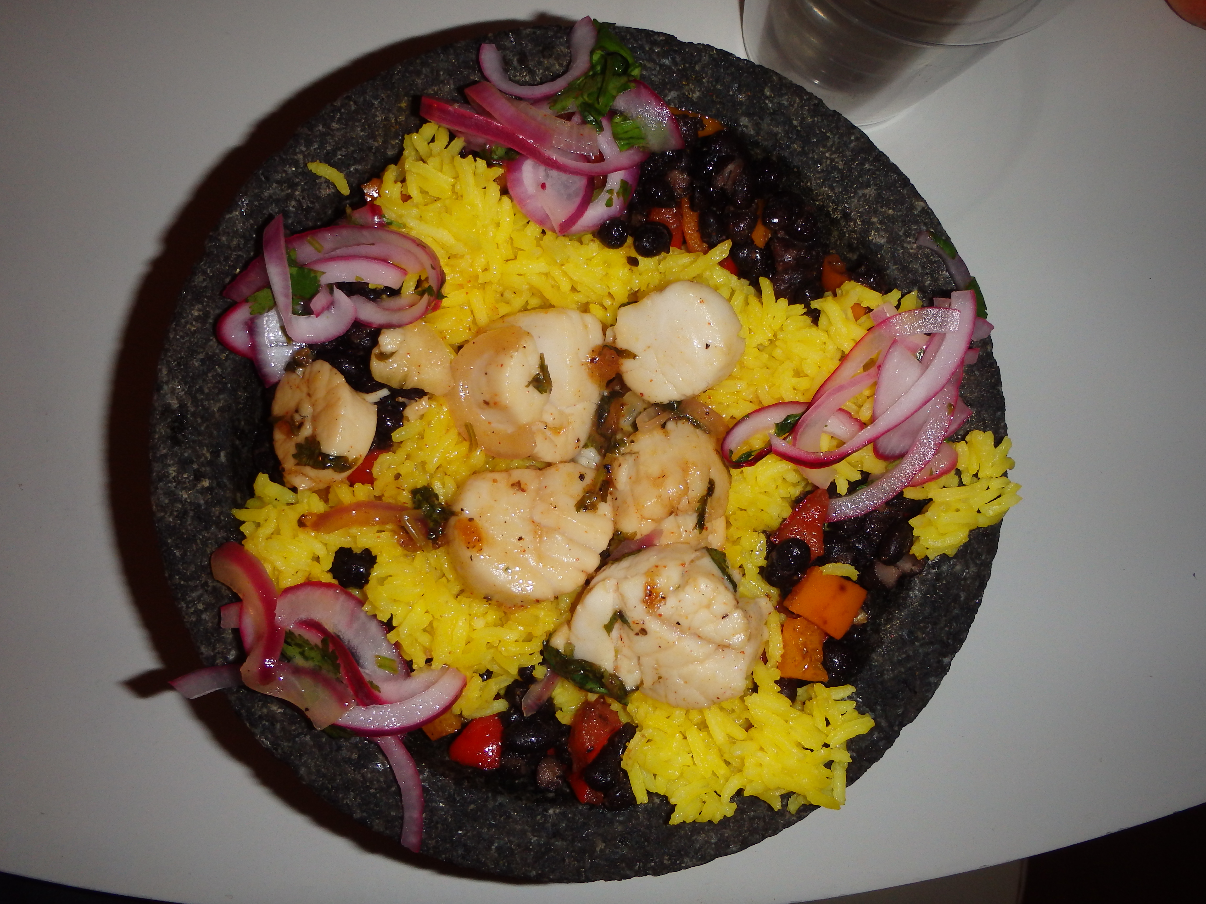 Pan 2: Sear the scallops in extra virgin olive oil, salt, and pepper. All the juice that is left over is poured on top of the rice.