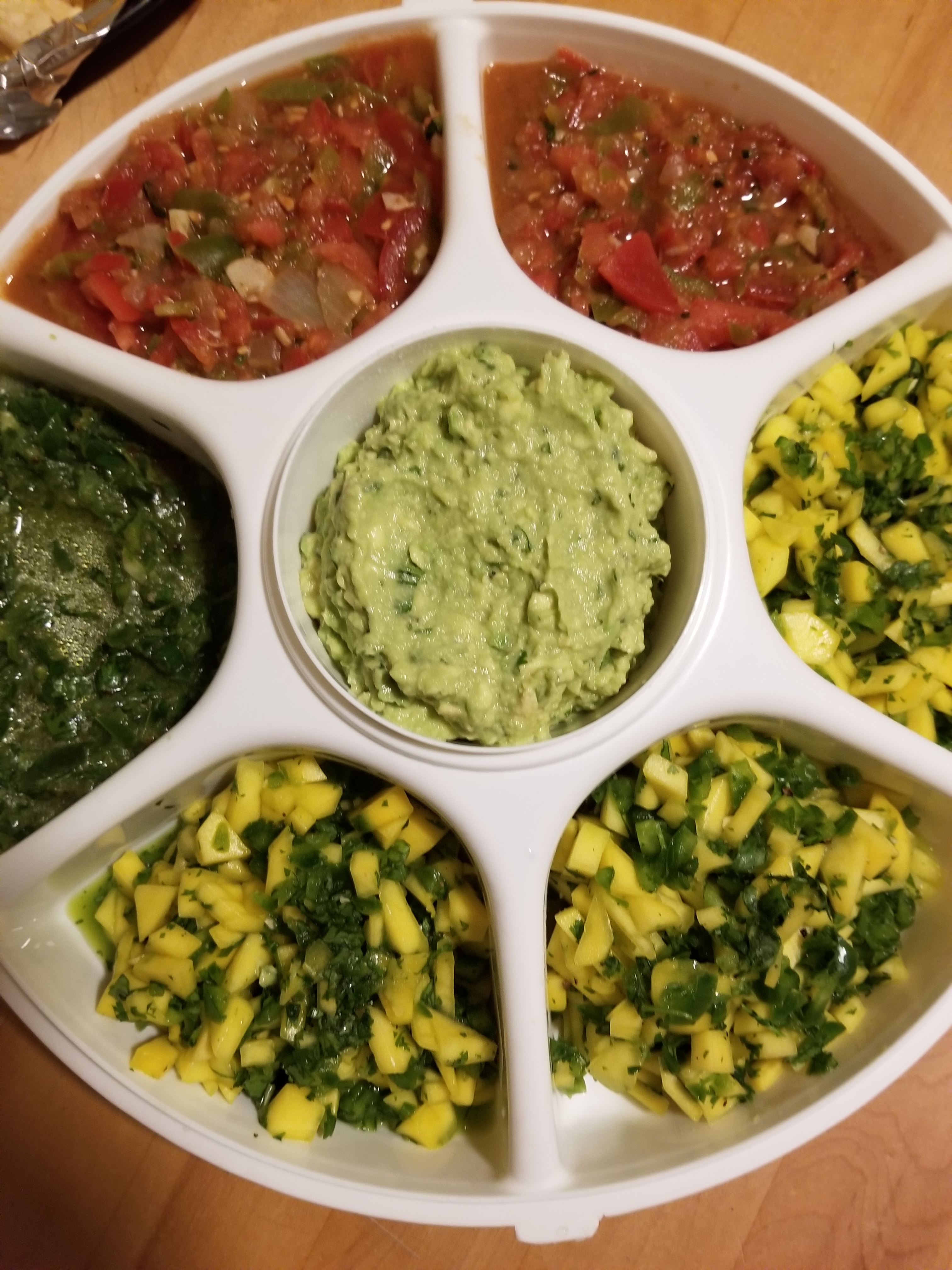 Mango Salsa: Slightly hard mangoes (very important!), lime, cilantro, a little salt and pepper.
