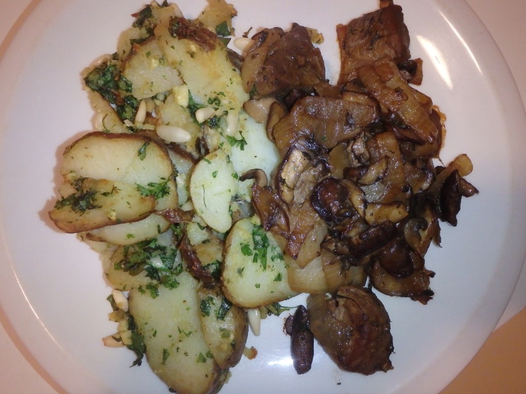 Ingredients: Russet potatoes (bake them whole in the oven coated with olive oil, salt, and pepper covered in tin foil, slice the cooled baked potatoes, fry in safflower oil to brown and crisp the edges. In a separate bowl mix extra virgin olive oil, parsley, fresh garlic, garlic powder, parmigiano reggiano/romano blend grated cheese (Tietel Bros in the Bronx has the best!!). Lastly, pine nuts!!! This was a last minute addition I though would pair well and it sure did!!!