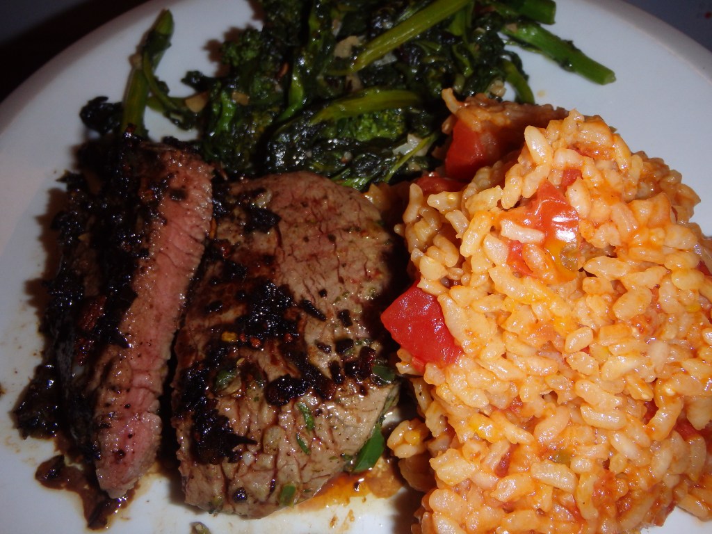 Filet mignon steak marinaded in olive oil, salt, pepper, garlic, jalepeno pepper.