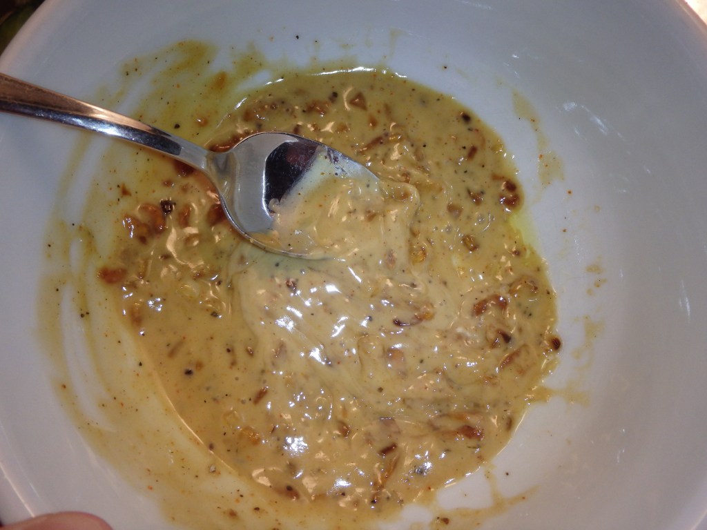 Roasted Garlic Aioli Ingredients: lightly roasted garlic in olive oil, salt, pepper, mayo, lemon juice, dijon mustard, cayenne pepper, Worcestershire sauce. Not my idea! Comes from the legend Guy Fieri.