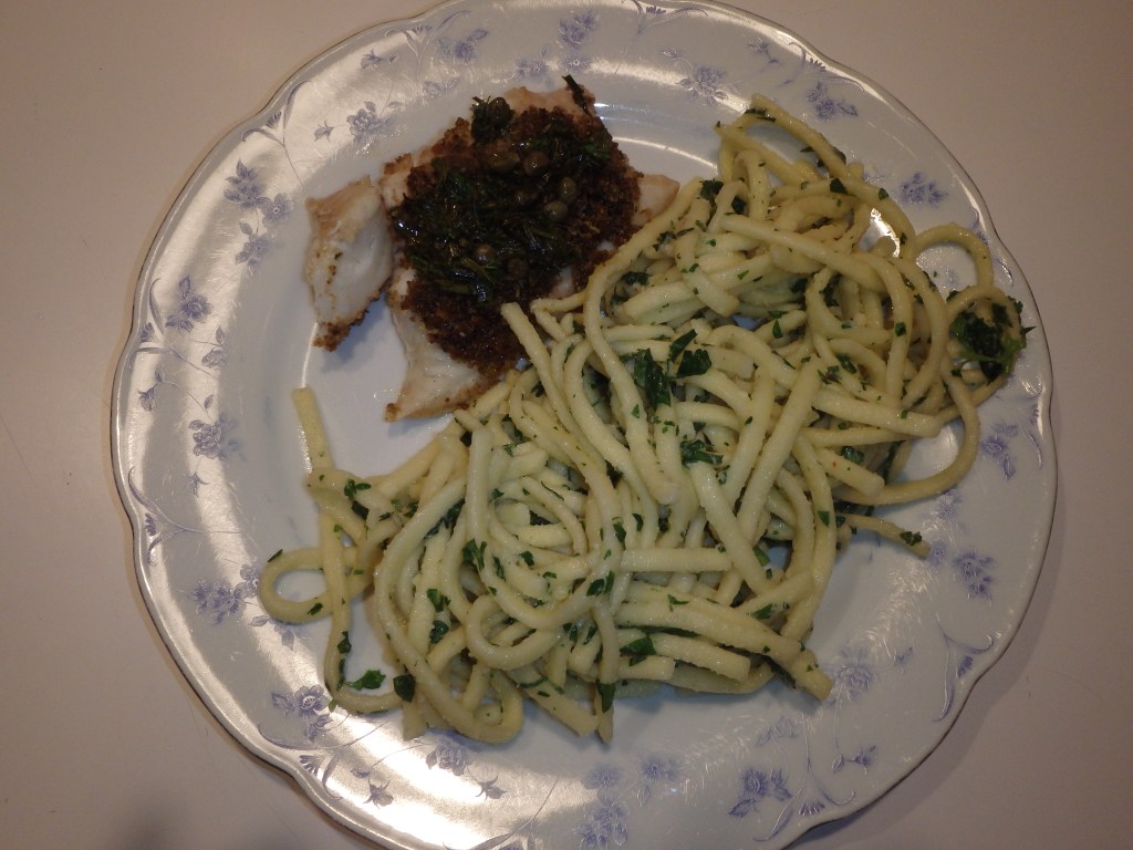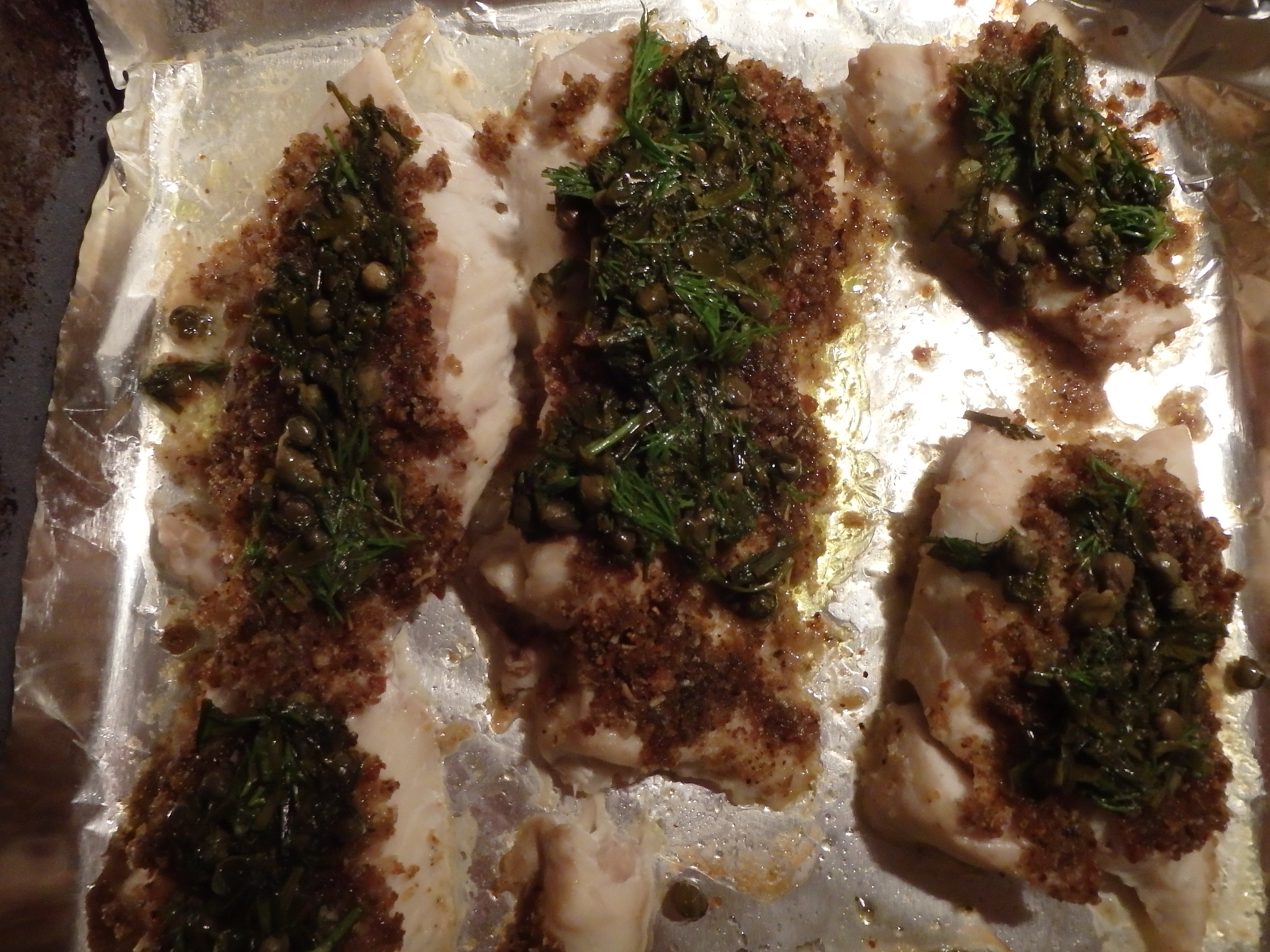My friend from work is a great fisherman, and one day he brought in some of the fresh fish he had just caught. I put a lot of thought into how to prepare this fish. I finally decided on a breadcrumb topping with a lemon caper herb sauce to spread on top. It was perfect, full of flavor yet it did not hide the fresh taste of the fish.