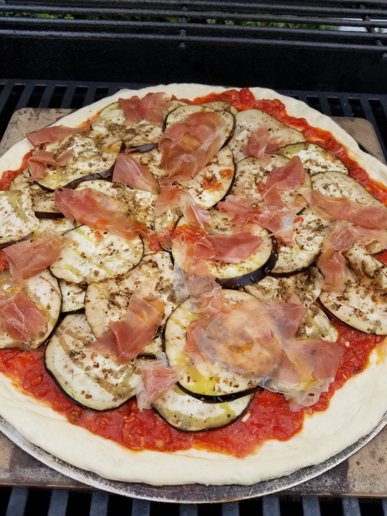 To make: Terra Nova New York style pizza dough, make the sauce with organic chopped tomatoes, shallots, garlic, salt pepper, pecorino romano, parmeggiano reggiano, extra virgin olive oil, oregano, fry eggplant with homemade italian breadcrumbs in very little oil, otherwise, eggplant will absorb all the oil, fresh basil, prosciutto di parma.