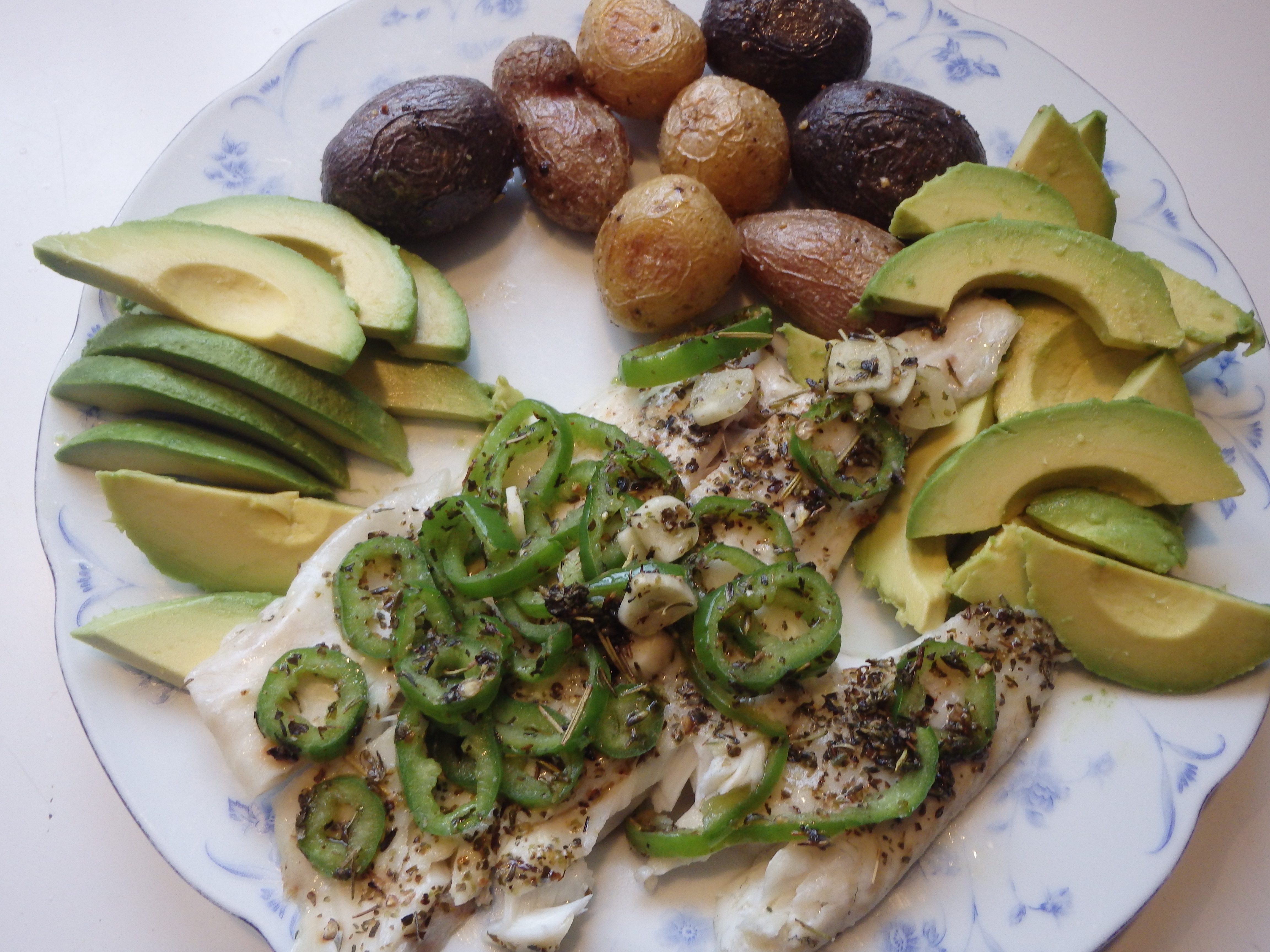 Ingredients: Farm raised Bronzini imported from Greece, drizzle fish with extra virgin olive oil, sprinkle salt, pepper. Mix Anaheim pepper, EVOO, fresh garlic, and herbs de Provence in a small bowl. Spread on top of fish. Pull up the edges of the aluminum foil to make side walls when cooking the fish. Organic baby potatoes coated with canola oil/salt/pepper. Organic avocado