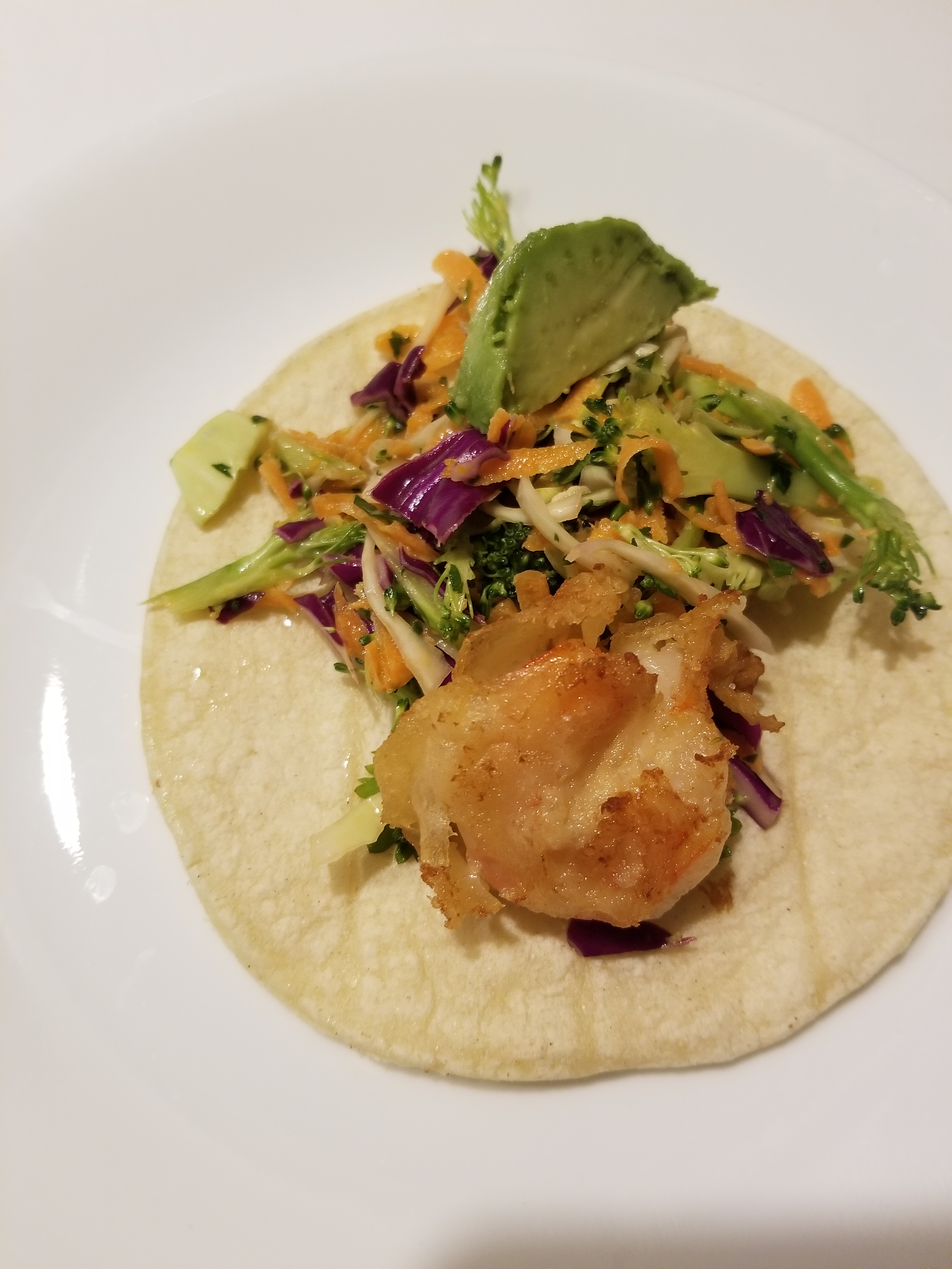 Citrus Slaw: Shred purple cabbage, green cabbage, organic carrots, and organic broccoli, and cilantro. For the dressing: Fresh juice from a lime, fresh juice from a grapefruit, diced ginger, walnut oil, zest from an organic Cara Cara orange, very little mayonnaise, and sugar