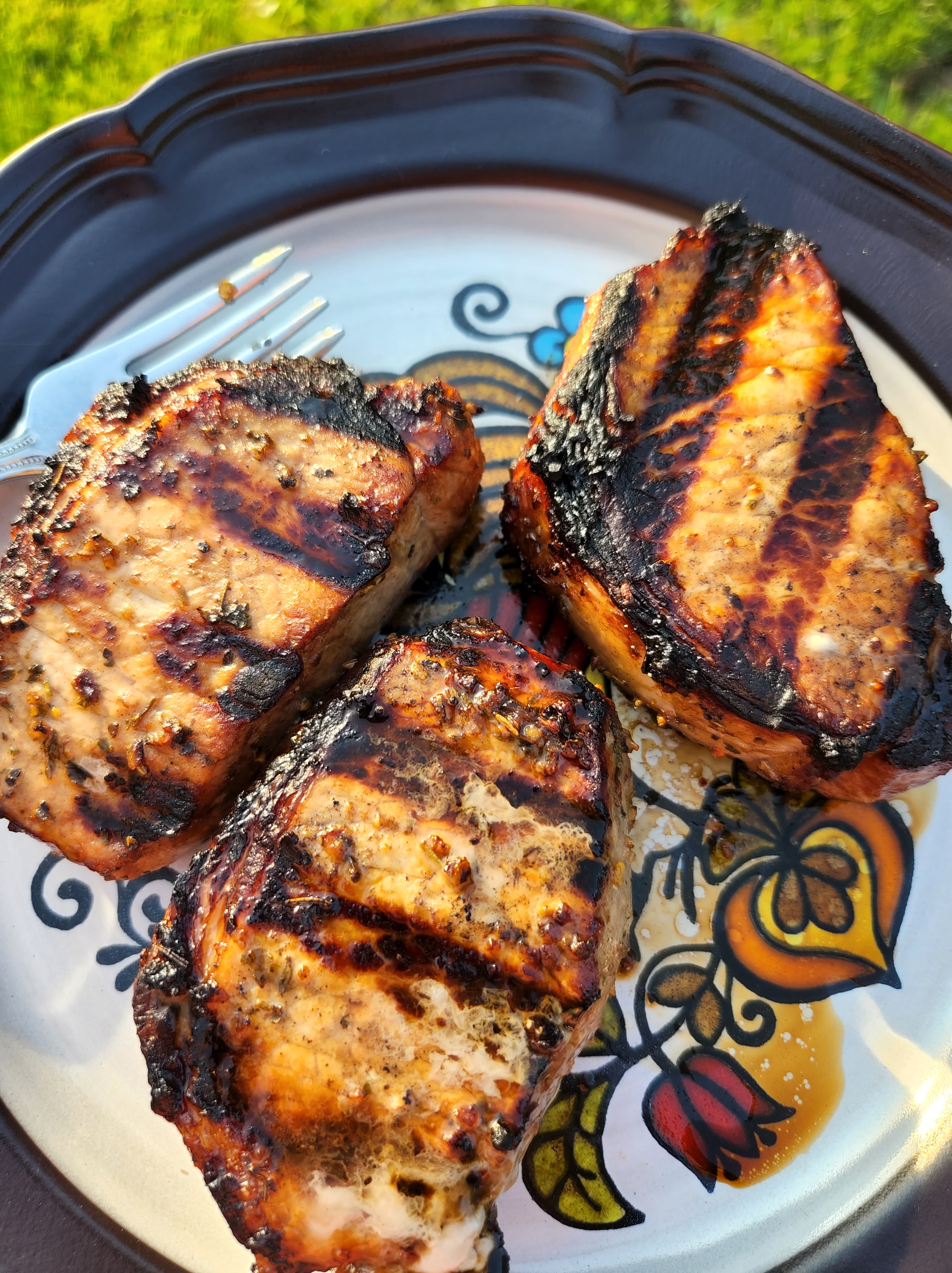 Marinade: Light brown sugar, salt, Worcestershire sauce, balsamic vinegar, coconut aminos, Willliams & Sonoma pecan wood smoked spice blend, dijon mustard, light olive oil