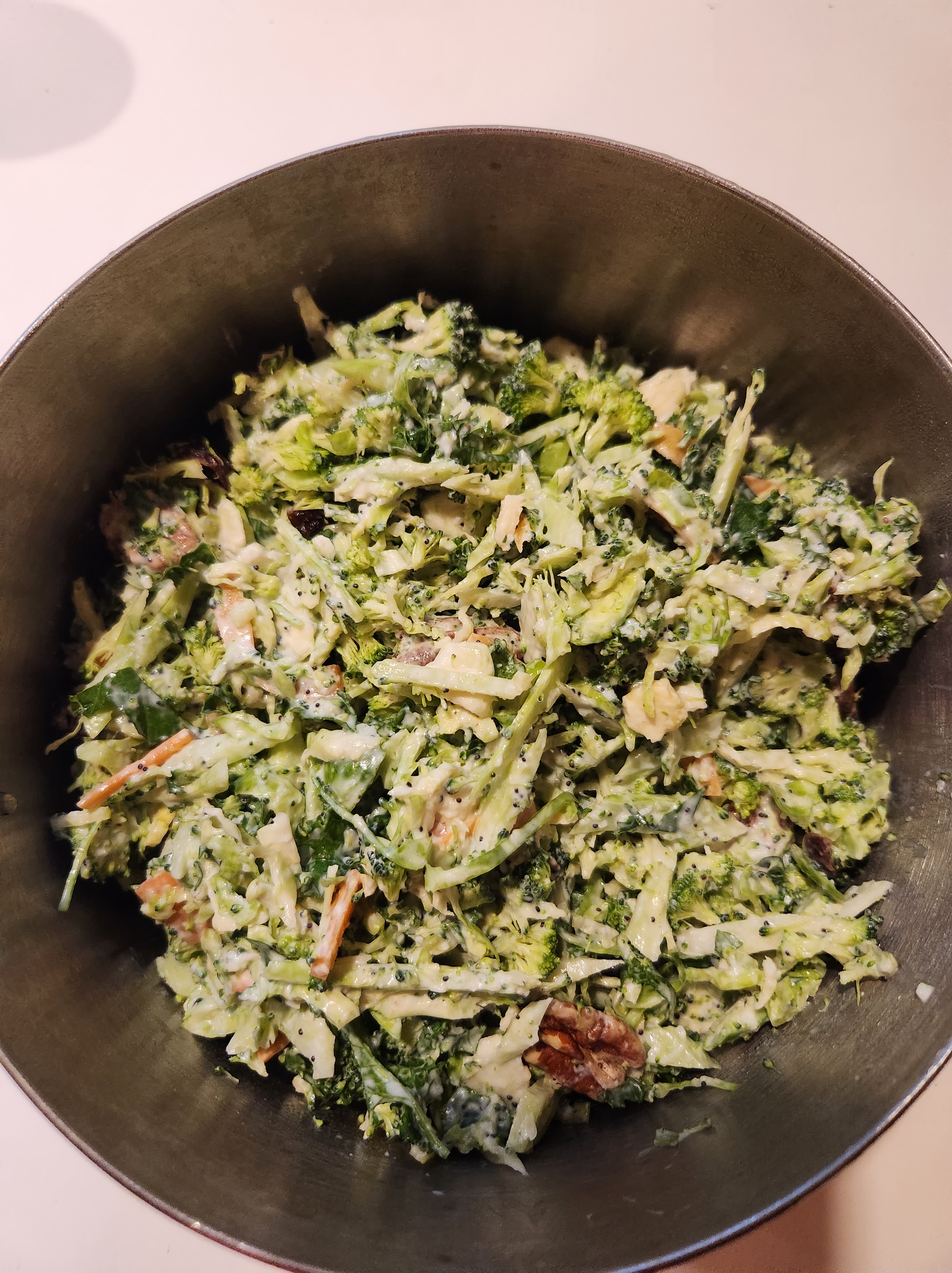Ingredients: Broccoli (sliced very thin), Brussel sprouts, kale, carrot, dried cranberries, pecans, Poppy seed dressing: Fage (5% milkfat) Greek yogurt, splash of white champagne vinegar, shallot, garlic powder, cane sugar, canola oil, fresh squeezed orange juice (only a few slices), a little orange zest (optional), poppy seeds.