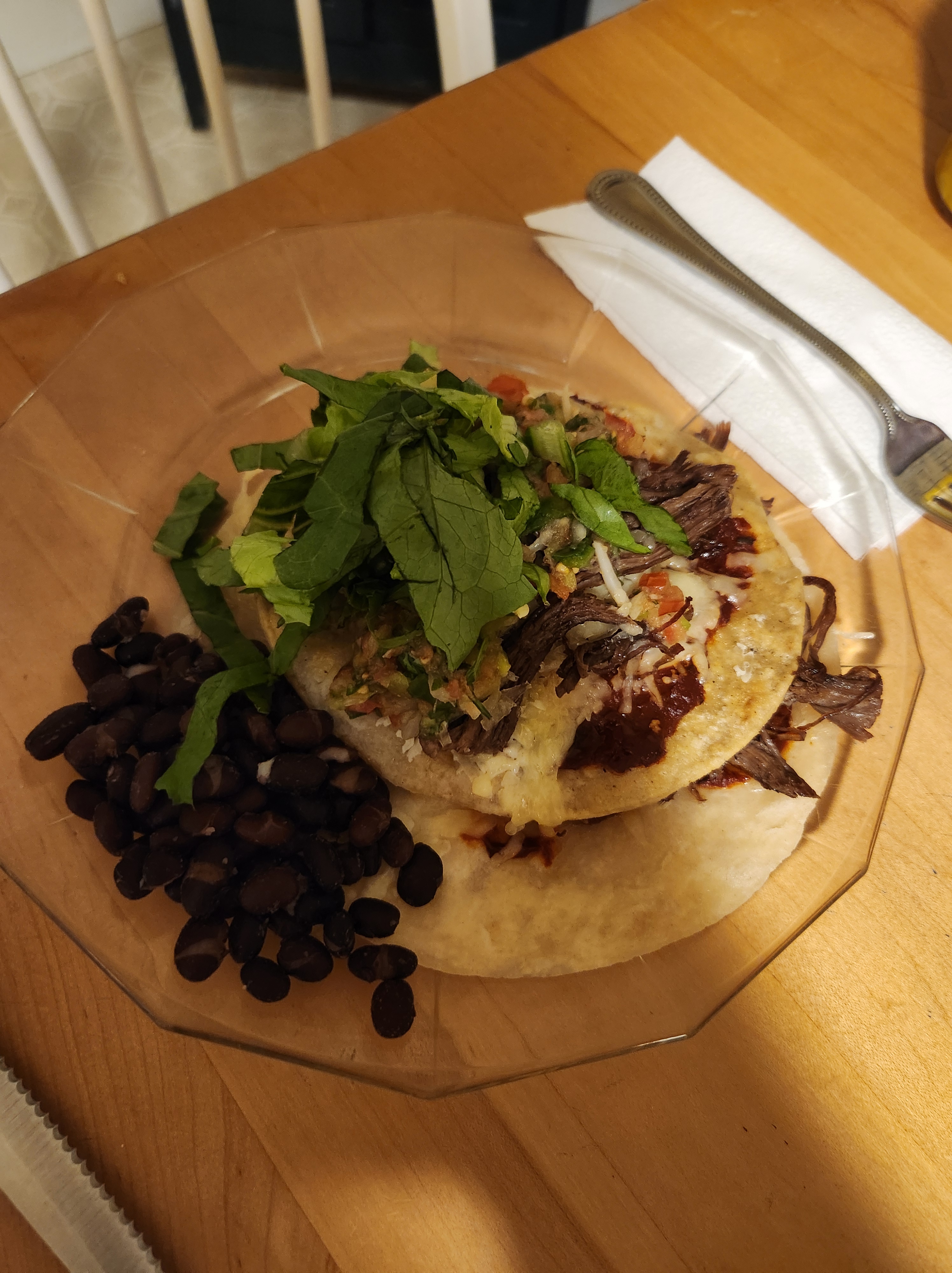 Layer flour and corn tortillas, with mild cheddar cheese, adobo sauce, pico de gallo, and meat/tofu . Heat in oven for everything to melt together.