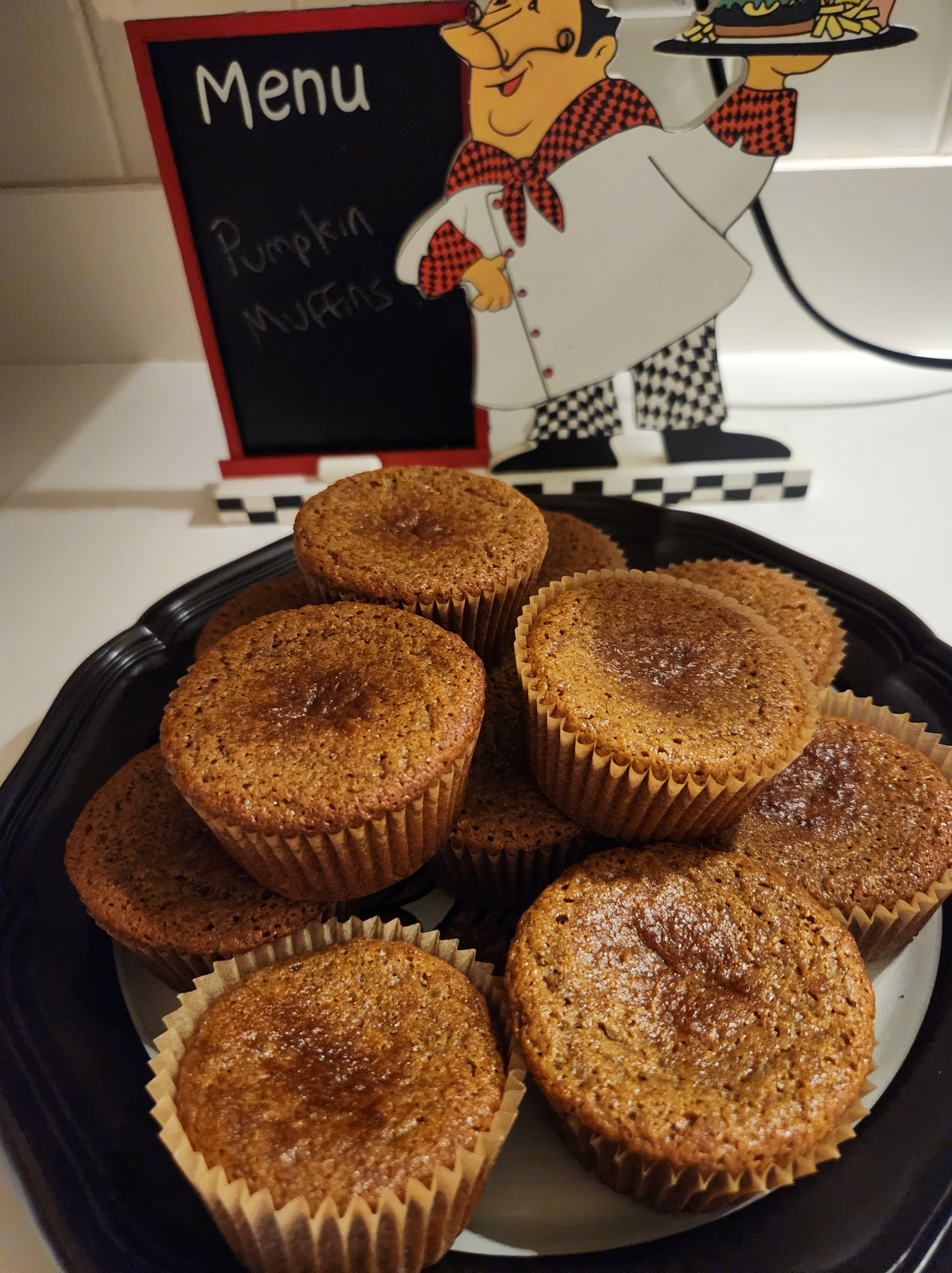 Ingredients: In bowl #1 mix: 1 cup of spelt flour, 2 tsp baking powder, 1/2 tsp baking soda, 3 tsp pumpkin spice powder, 1/2 tsp nutmeg, 2 tsp cinnamon, 1/4 cup malted milk powder. In bowl #2 mix: 1 egg, 1/2 cup pumpkin puree, 1/2 cup of sugar, 1/4 cup of melted butter, 2 tbs canola oil, 1/2 cup milk, freshly ground anise pod and clove (1 of each), 2 tsp vanilla extract, 4 table spoons of sour cream.