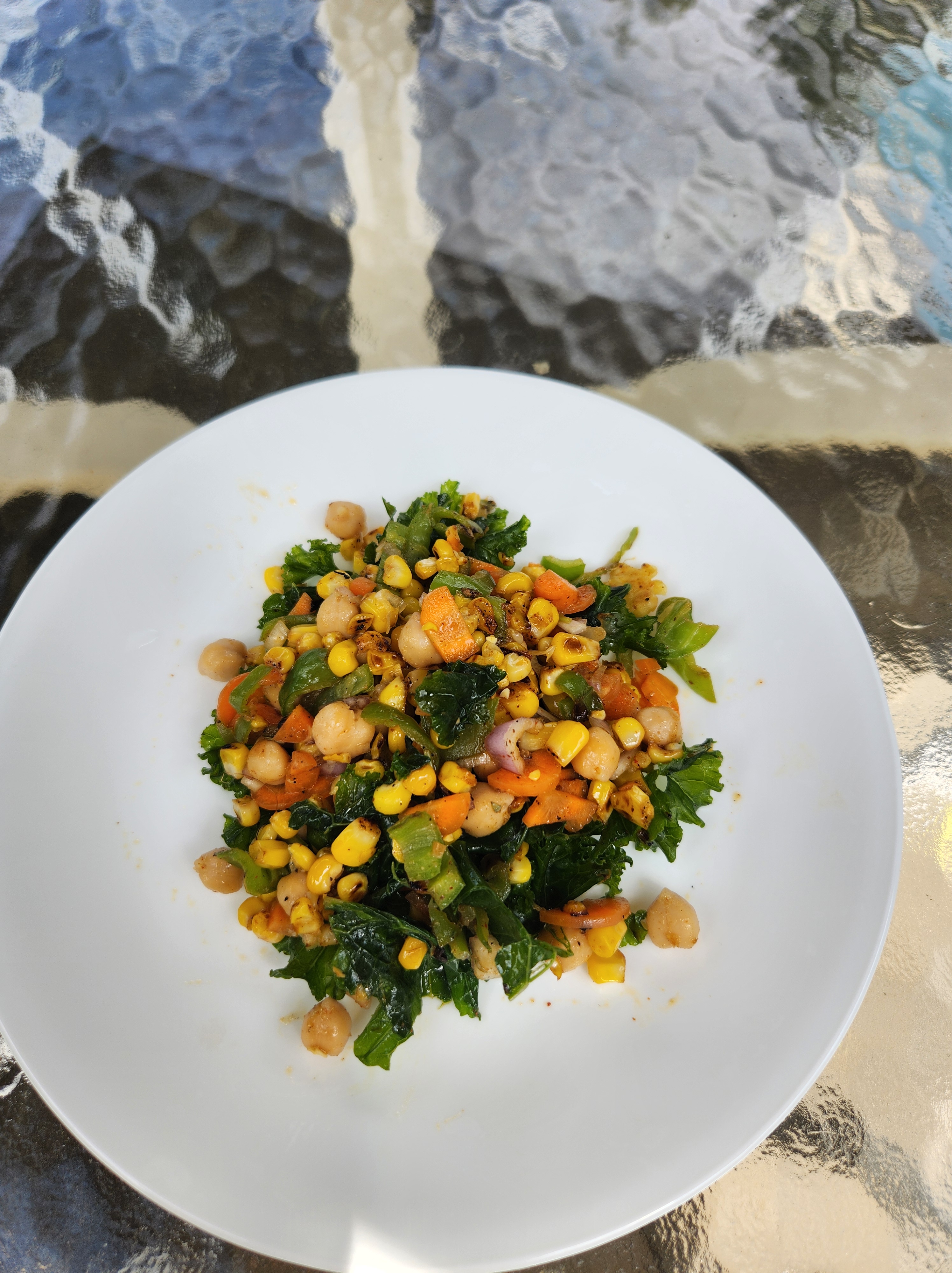 Ingredients: Long green peppers (from garden), fresh corn, shallot, kale, carrots (from garden), chickpeas, oregano (from garden), EVOO, salt, cracked peppercorns, smoked paprika, ancho chili powder.