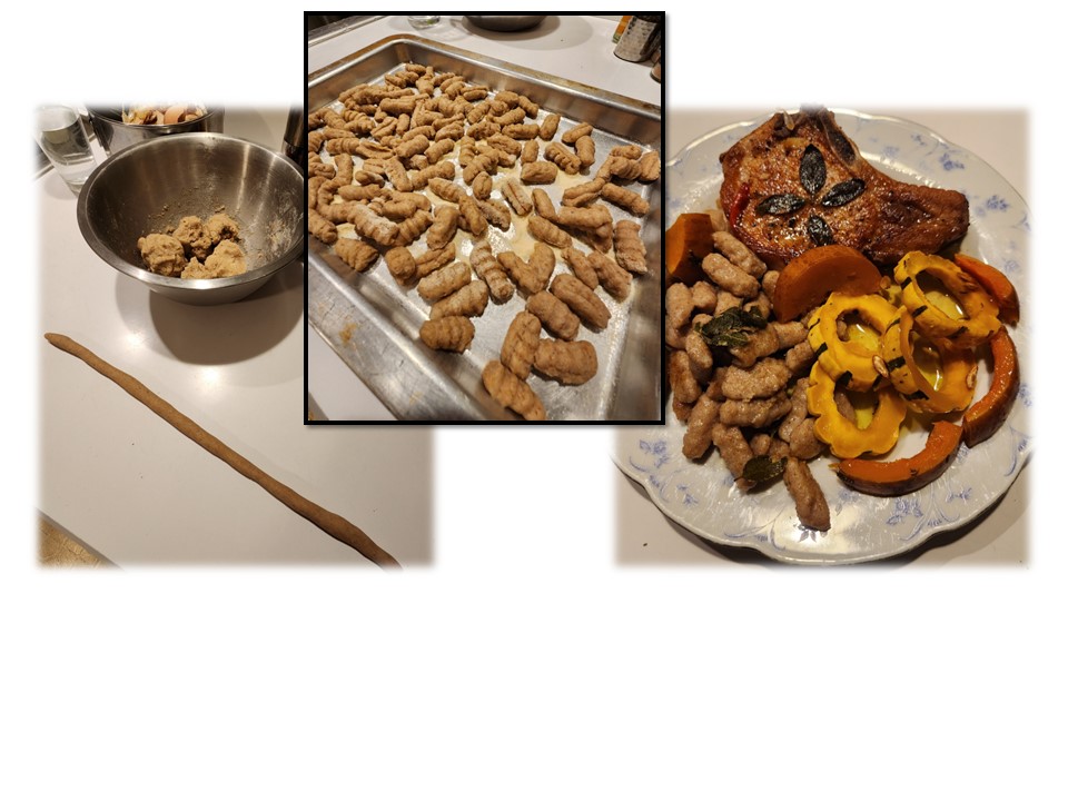 I attended a seminar where I learned all about rye grains, and the various things you can make with it. I was also given a bag of freshly milled ancient grain flour by the farmer who grew it! Thank you Wild Hive Farm for this bag of freshly stone milled flour. This batch came out good, but there is still room for improvement. Next time, I will add a little milk to the dough, use less mashed potato, and work the dough a little longer so the gnocchi are a bit firmer.