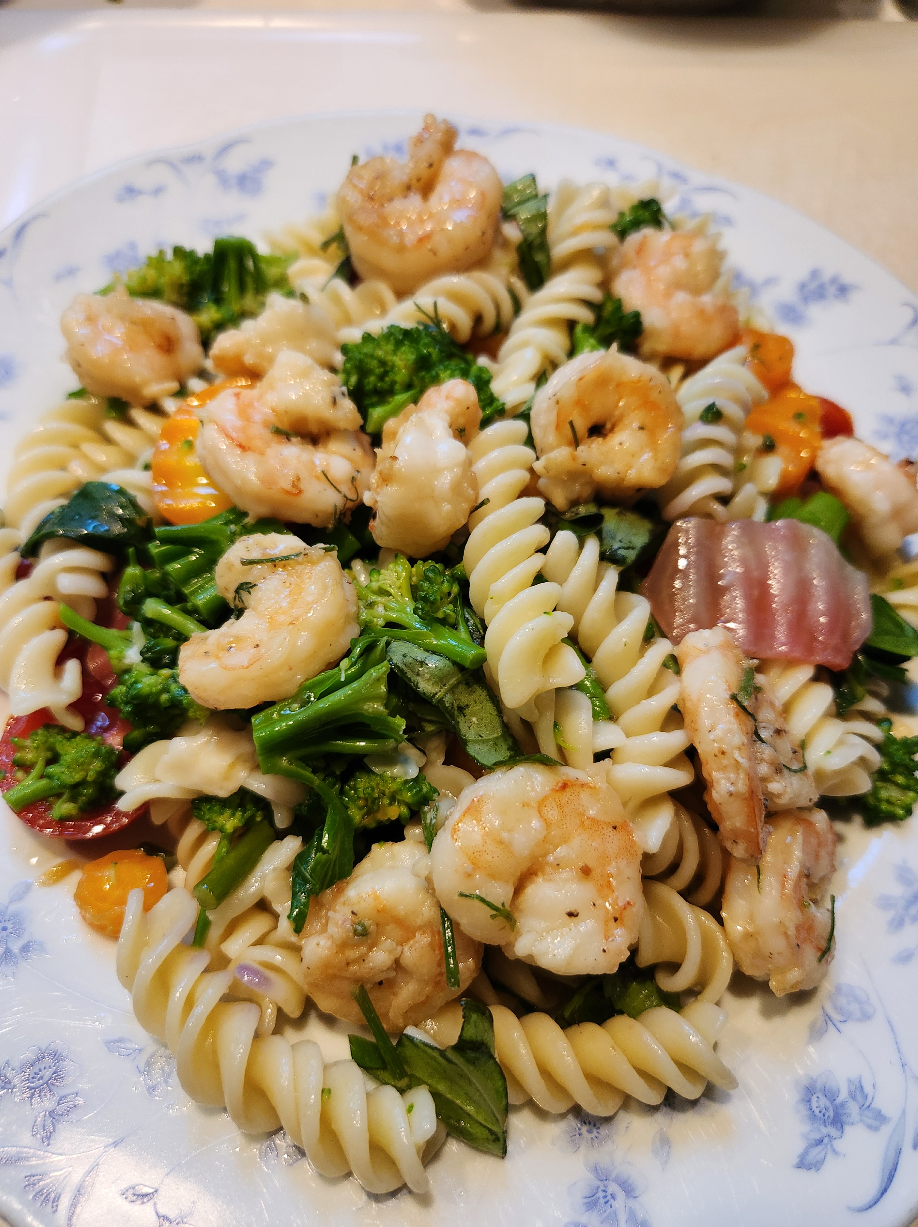 In a pot of boiling water, cook the following until just able to pierce a fork through (but should still be slightly firm, cookingtimes vary by size of vegetable): Broccolini, carrots, beets. Slice and salt cherry tomatoes, keep on the side. Slice basil, keep on side. Once boiled vegetables are done add into a pot and add olive oil, salt, and a little cane sugar. Make a garlic oil in a small saucepan. Boil fusilli. Add shaved cheese of whatever you like. Add shrimp.