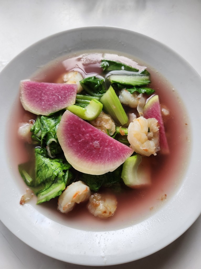 Ingredients: Reclamation Foods Korean-Style Pork bone broth, watermelon radish, bak choy. Sear on med-high heat shrimps, olive oil, canola oil, garlic, and shallot. Deglaze with sake. Add into soup.