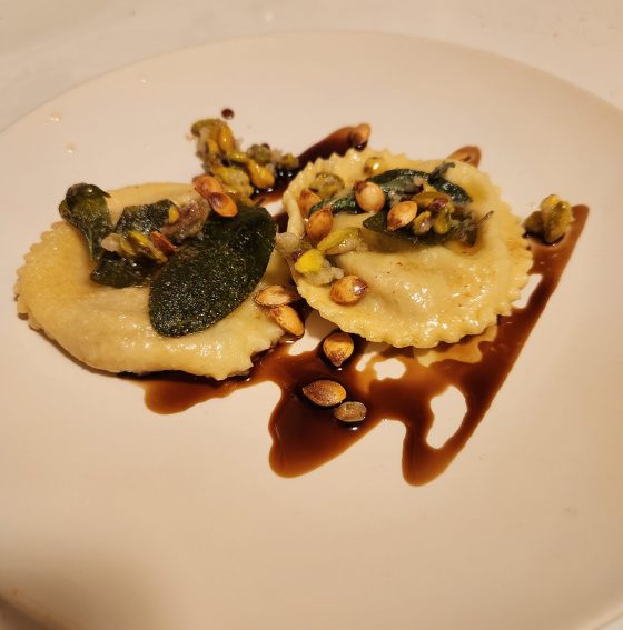 Delicata Squash Ravioli with Honey Pistachios and Balsamic Drizzle