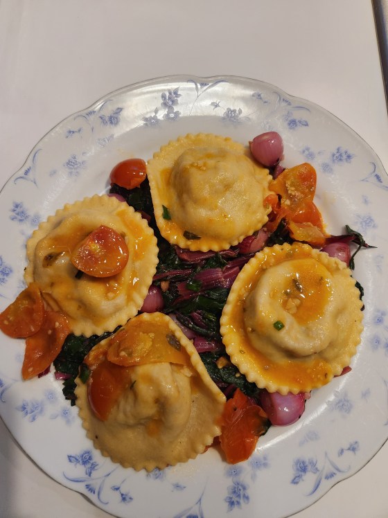 Swiss Chard & Red Pearl Onions with Meat & Cheese Ravioli